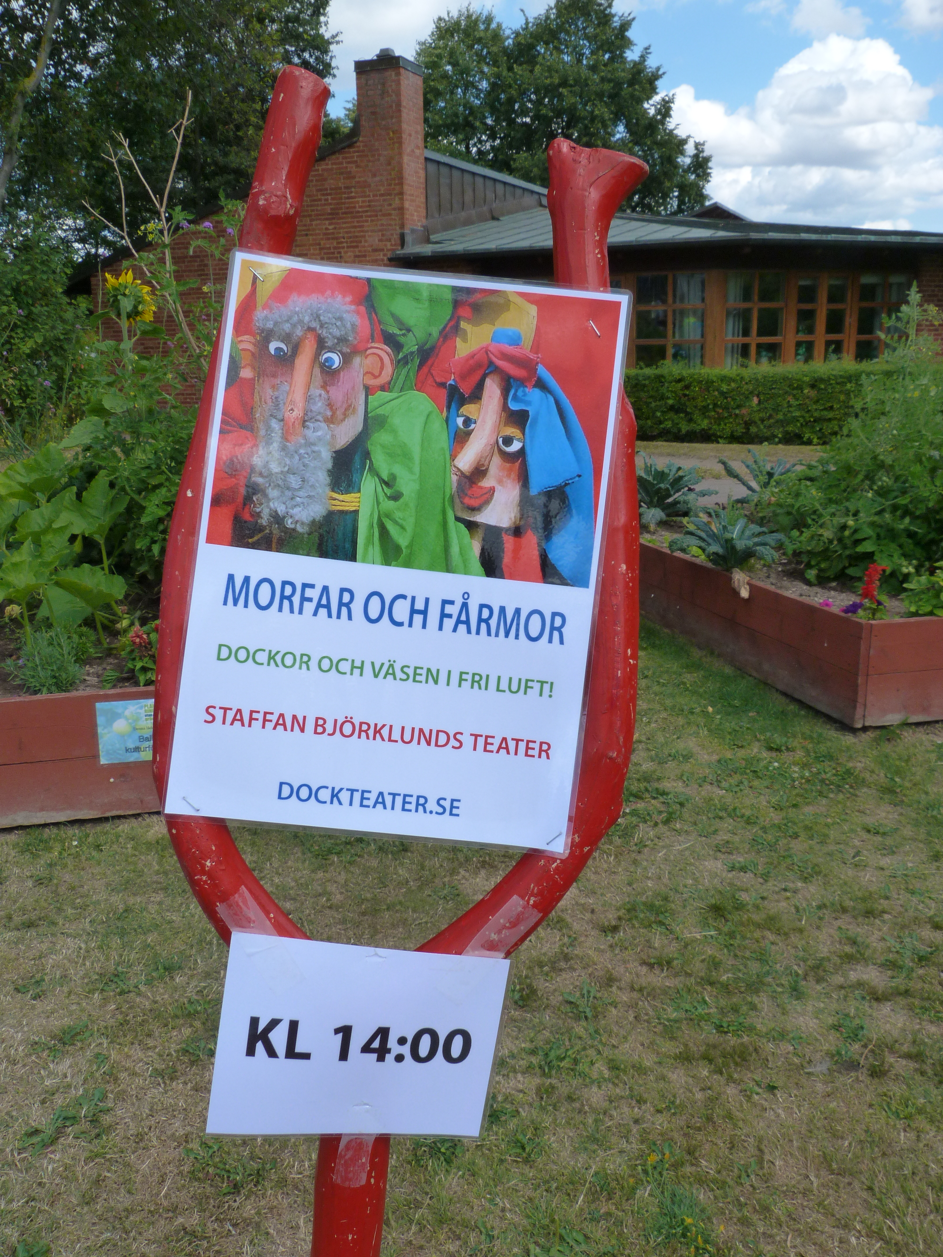 Igår var Staffan Björklunds teater vid odlingslådorna och spelade upp sin dockteaterföreställning Morfar och Fårmor. Det var många barn och vuxna som hade samlats för att se föreställningen. Efteråt fick alla som ville tillverka sin egen docka och det blev många fina potatis-igelkottar. Föreställningen är en del av gatuteater festivalen Passage som pågår nu i Helsingborg och Helsingör.