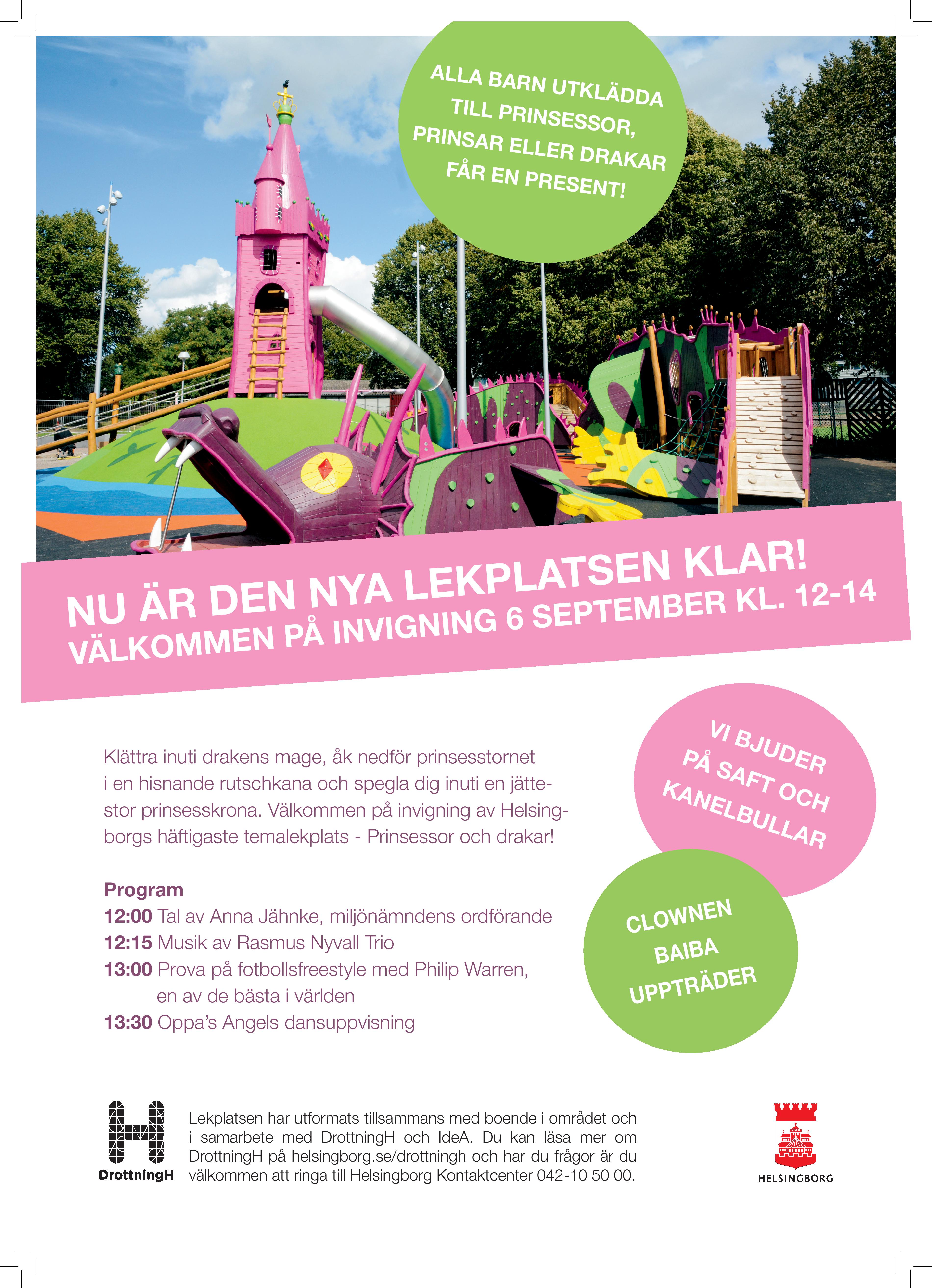 Lördagen den 6 september klockan 12 är det dags för invigning av den nya lekplatsen. Kom och testa rutschkanan från prinsesstornet, att klättra i drakens mage eller varför inte spegla dig inuti den stora prinsesskronan. Alla barn som är utklädda till prinsessor, prinsar eller drakar kommer även att få en present.