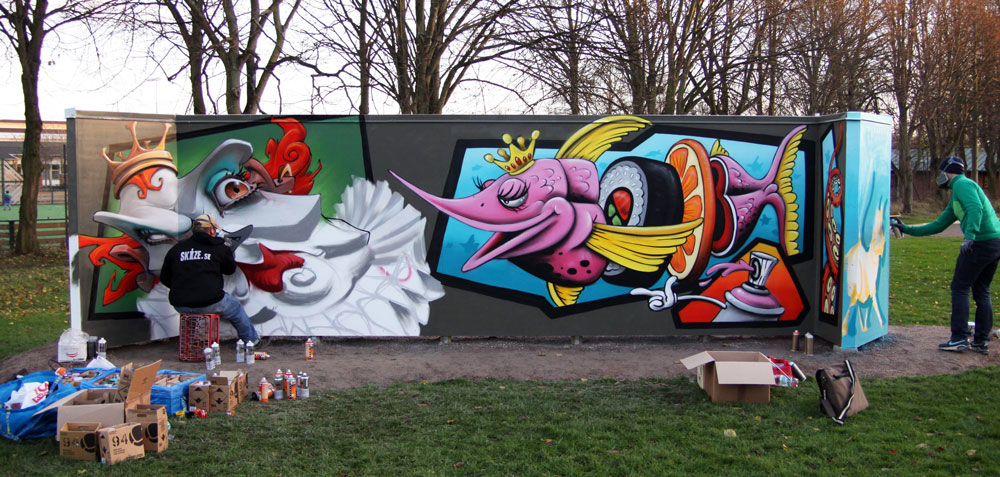 På lördag är det dags för konstväggen på Drottninghög att få en ny design. Det är återigen graffitikonstnärerna Tim Nedrup och Andreas Enelind (N/E Walldesign) som står för utformningen, den här gången tillsammans med ungdomar från området. Konstnärerna målar ena sidan av väggen och handleder ungdomarna genom design och målning av den andra sidan.