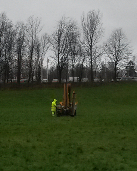 I början av januari kunde du se en liten bandtraktor som arbetade i hålan. Nu i början av Mars kommer den tillbaks. Det är konsultfirman Sweco som på uppdrag av Stadsbyggnadsförvaltningen kommer att göra fler undersökningar av marken i och kring ”Solhålan”.