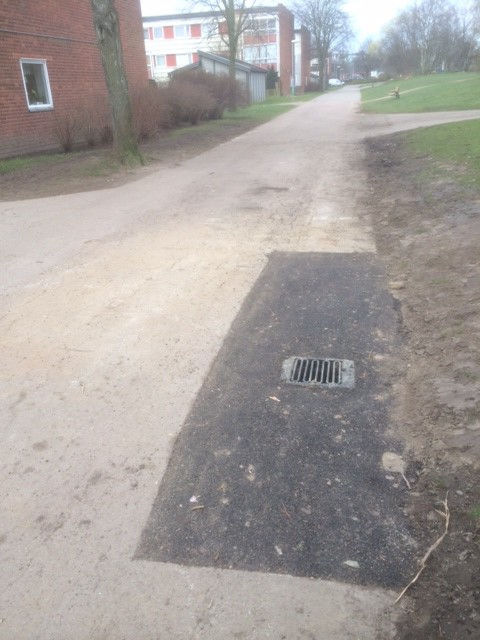 Den befintliga brunnen i marken har inte mäktat med att svälja undan mängden vatten vid intensivt regnande, varpå det ibland blivit som en mindre insjö. Helsingborgs stad har på ett proffsigt och långsiktigt sätt åtgärdat problemet, en ny brunn med större kapacitet är nu nergrävd på platsen så att alla kan passera torrskoda.