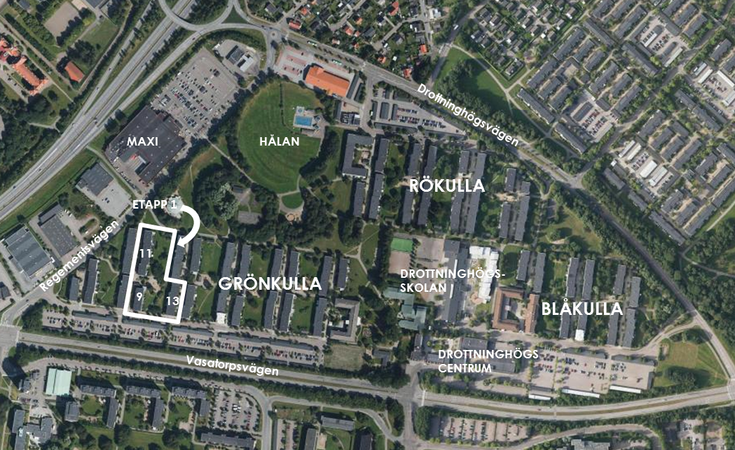 Här börjar vi. De markerade husen omfattas av ombyggnaden i etapp 1. På sikt kommer utvecklingen inom projekt DrottningH att beröra alla bostäder på Drottninghög. I dagsläget finns det inga beslut om vad som ska hända med övriga hus på området.