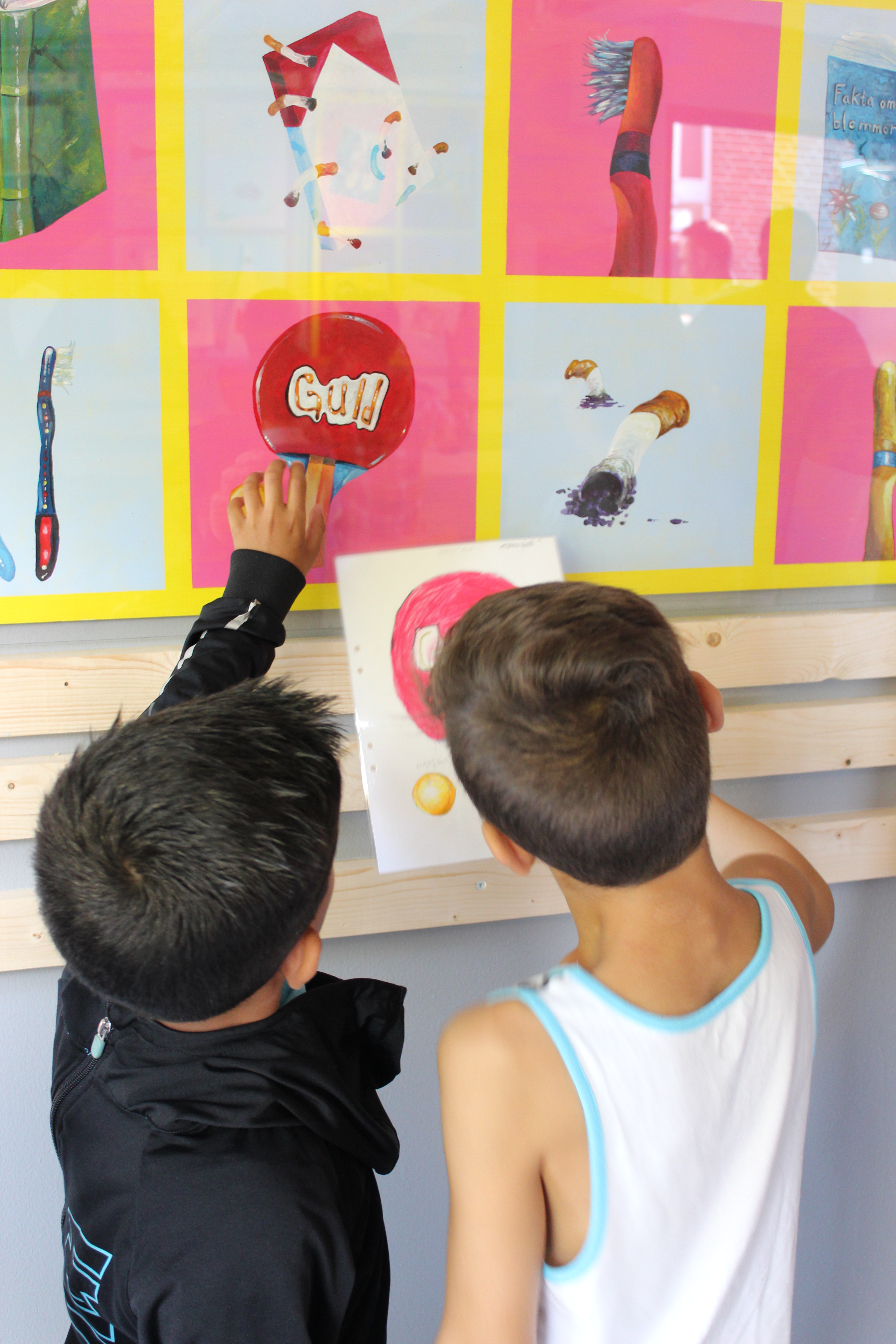 Nästa uppgift var att prata om skyltningen. Vi fick hjälp av en konstnär, Mattias Olsson, som coachade eleverna i arbetet med att rita av varsin ”sopa”. När eleverna var nöjda tog Mattias med sig skisserna till sin ateljé där han skapade POP-konst, men eftersom vi pratar om sopor bytte vi ut ett P mot ett S och istället blev det SOP-konst.