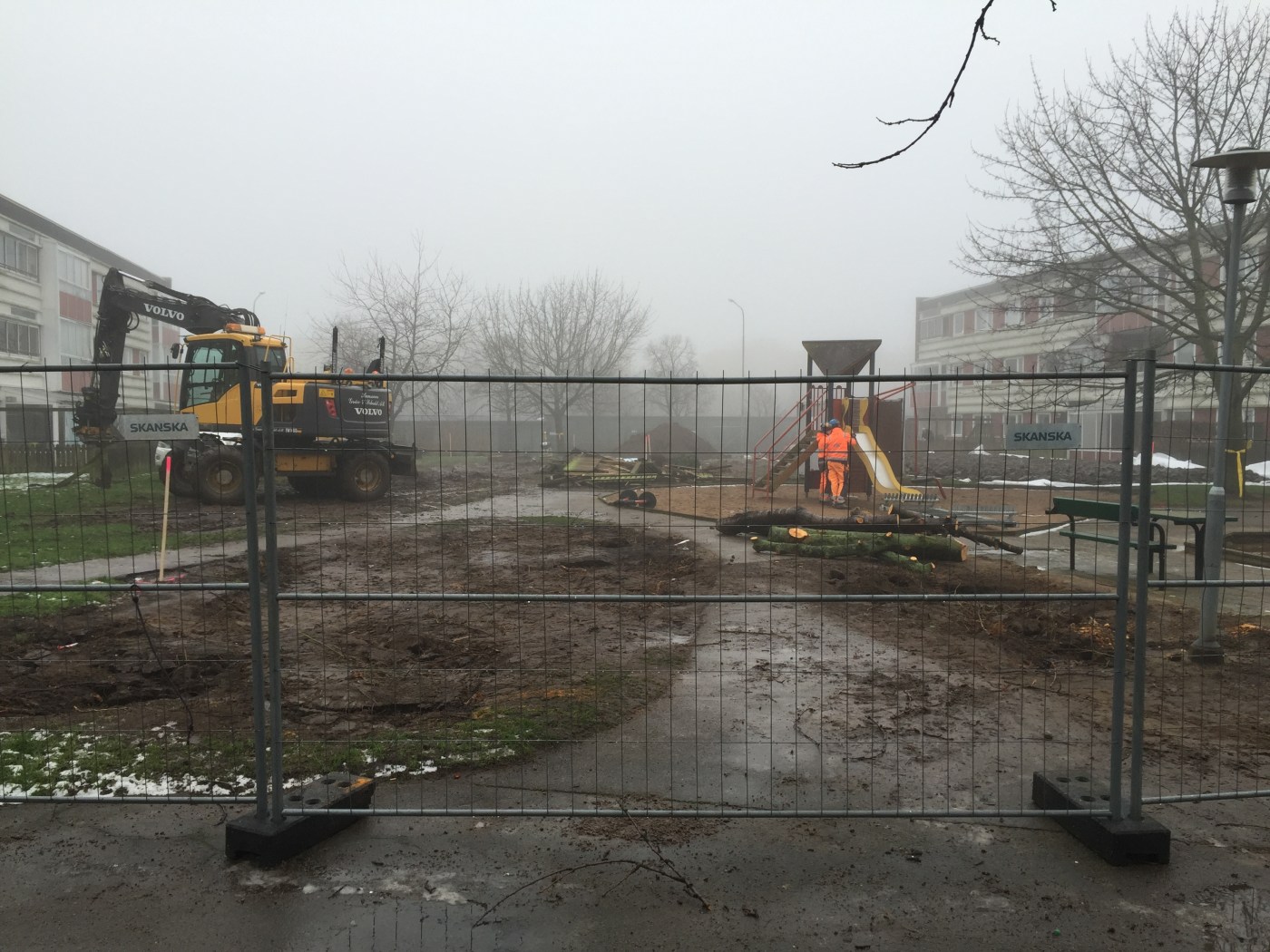 Det som händer nu är att man förbereder marken för att kunna ställa ut redskaps- och arbetsbodar på grönområdet mellan husen. Det kommer att ta ner en del träd och buskar som kommer att återställas då arbetet är klart. Under dagtid kommer det även att vara en del störande ljud.