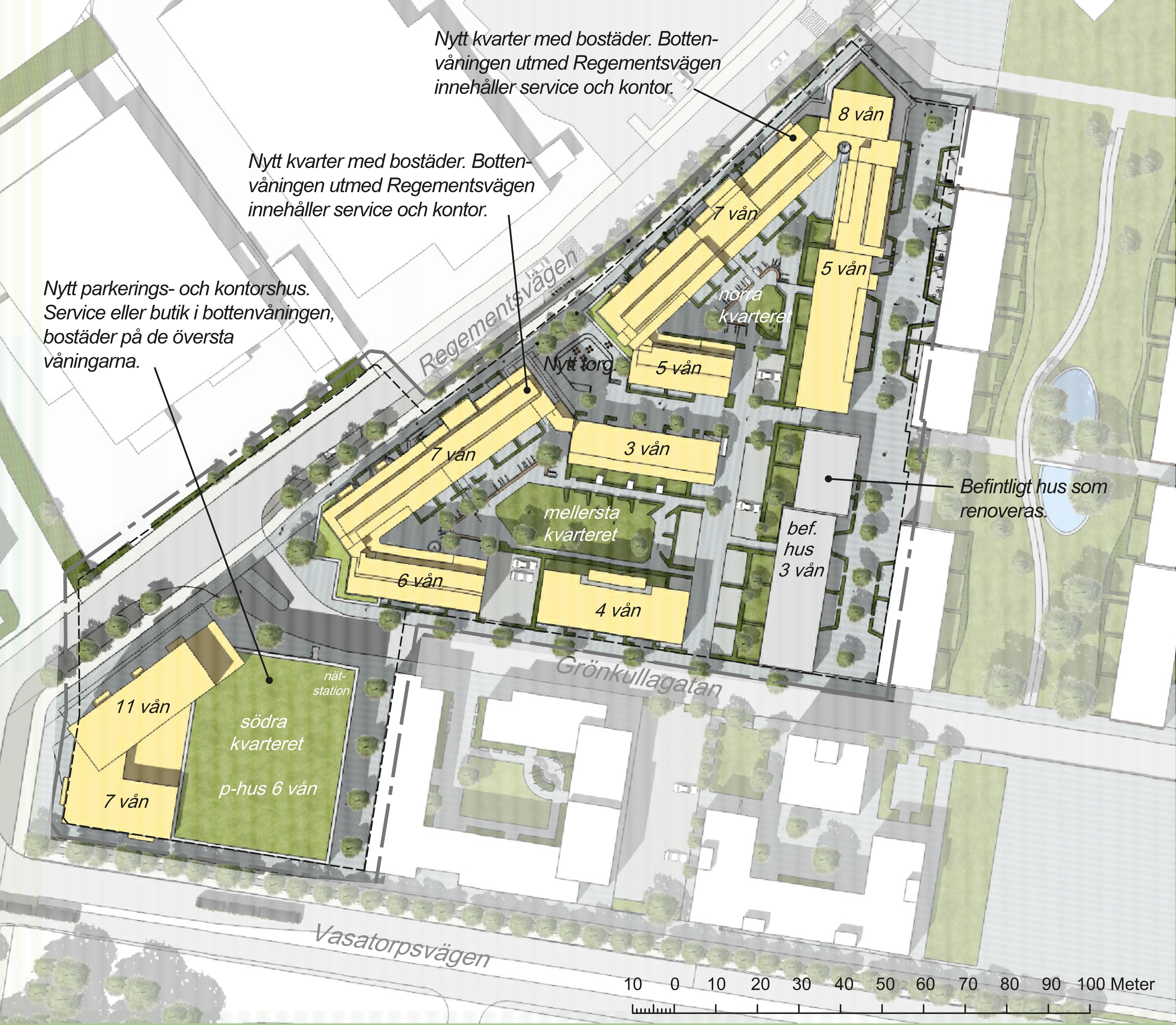 Detaljplanen beskriver vad marken får användas till och hur stora hus som får byggas där, här kan du läsa mer om hur detaljplaneprocessen fungerar. När det gäller västra Grönkulla gör den nya detaljplanen det möjligt att bygga fler bostäder för att nå målen i projekt DrottningH, vilket är att det på sikt ska finnas dubbelt så många bostäder på Drottninghög.
