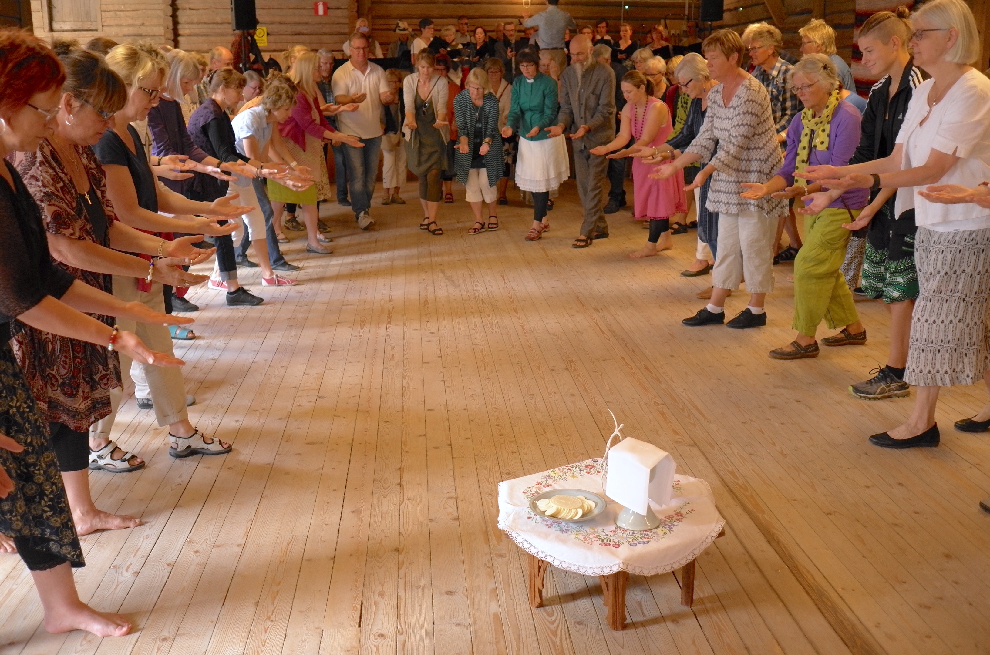 Besökarna i Den Gode Herdens kyrka är inte obekanta med dans i gudstjänsten men det är första gången som alla moment i mässan sjungs och dansas. Allt som allt är det tio danser och sånger som ska fylla kyrkorummet. Karin Fors, församlingspedagog i Filborna församling leder deltagarna i dans och rörelse.
