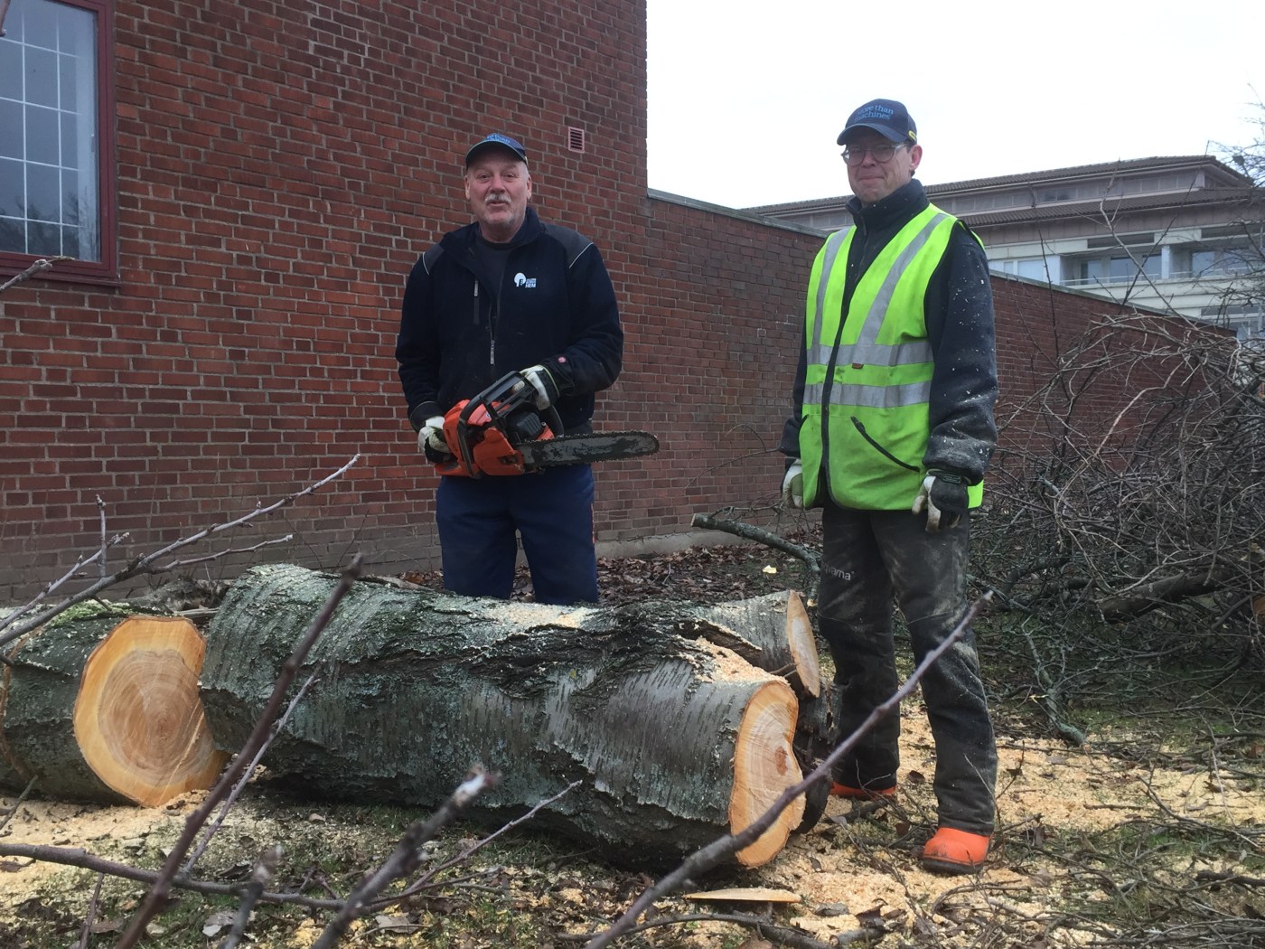 Bakom Ica håller Åke och Bengt från Helsingborgshem på med att ta ned bland annat ett körsbärsträd. De berättar att träden växer för nära Ica vilket gör att rötterna tränger in i huset och förstör bland annat golvet inne på ICA. Till våren kommer man att plantera nya växter som passar bättre. Äppleträdet som finns längre har man sparat då det inte påverkar huset och då det är populärt bland de boende att plocka äpplen från trädet.