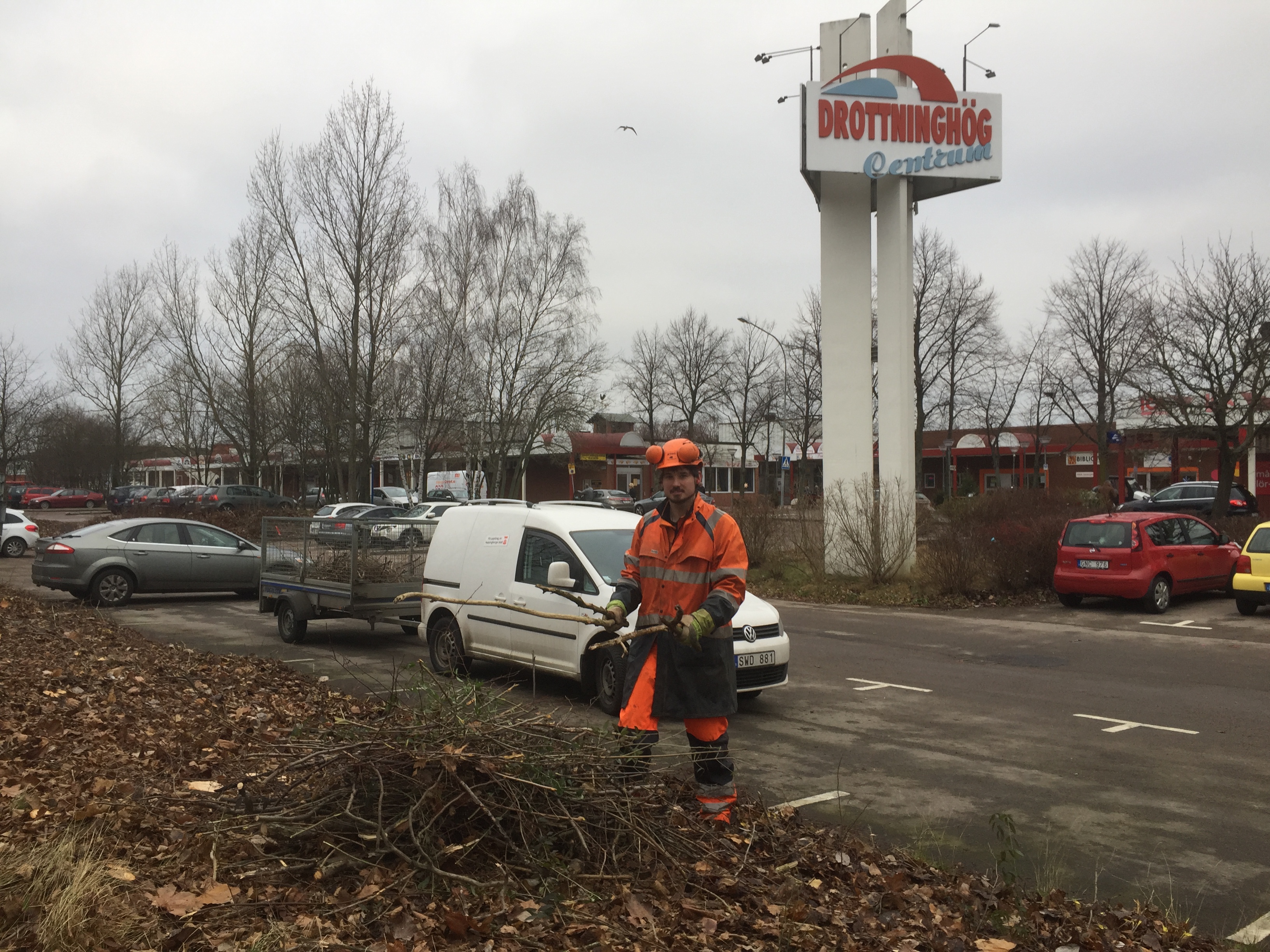 Vid parkeringen mot Vasatorpsvägen håller Stefan på att plocka undan de sista grenarna. Han och hans kollegor har röjt bort undervegetationen som tidigare var som en mur. Nu kan man se att det finns ett centrum här, säger Stefan. Det är många som passerar Drottninghögs centrum på sin väg in mot centrum men som inte vet vad som finns bakom buskarna. Nu kommer förhoppningsvis fler att hitta hit.