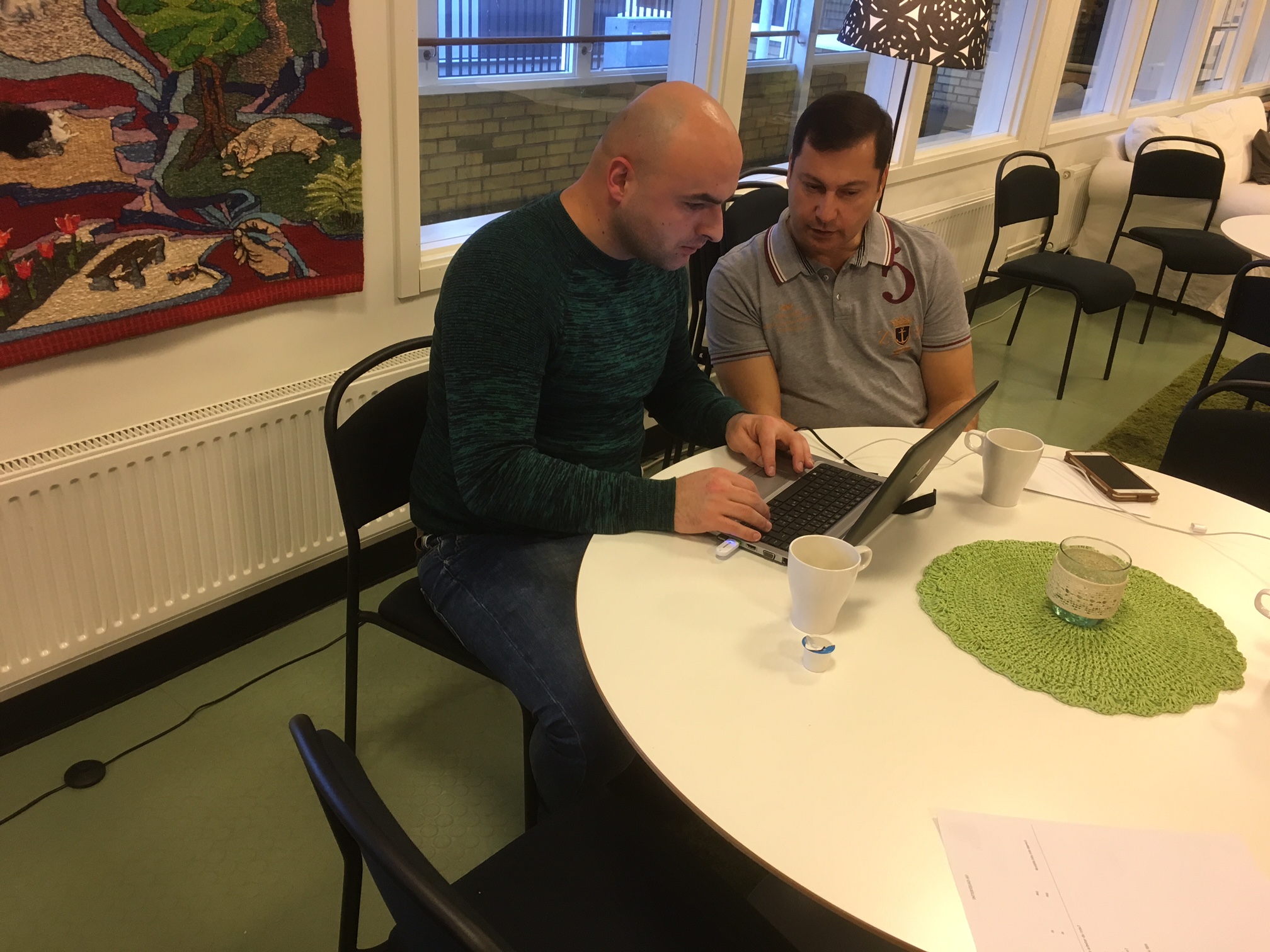 Coachen Besnik finslipar en jobbansökan med Firas, en av våra deltagare på Dalhem.