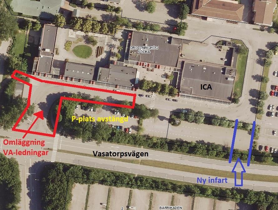 Vi kommer att stänga av Blåkullagatan vid korsningen mot Vasatorpsvägen och utanför bageriet, men man kommer fortfarande kunna köra in till centrum via en ny infart som finns på plats innan vi stänger av den befintliga infarten.