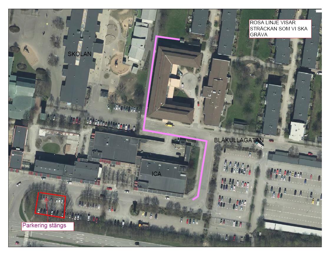 För att kunna göra detta behöver vi gräva upp cykelvägen som kommer att vara avstängd under arbetet. När vi är klara återställs cykelvägen. Därefter fortsätter vi på Blåkullagatan, se rosa markering i kartan. Infarter är tillgängliga under arbetet, förutom korta stunder vid själva grävningen.