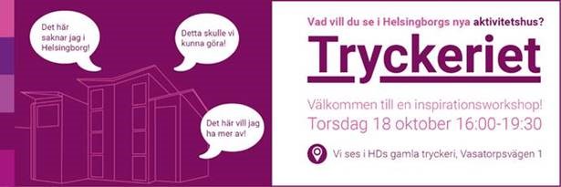 Nu är det dags att skapa Tryckeriet, Helsingborgs nya aktivitetshus. Vi behöver din hjälp! Kom och dela med dig av dina idéer och önskemål på vår inspirationsworkshop. Ung, äldre, entreprenör, eldsjäl, innovatör eller föreningsaktiv – alla är välkomna att tycka till!
