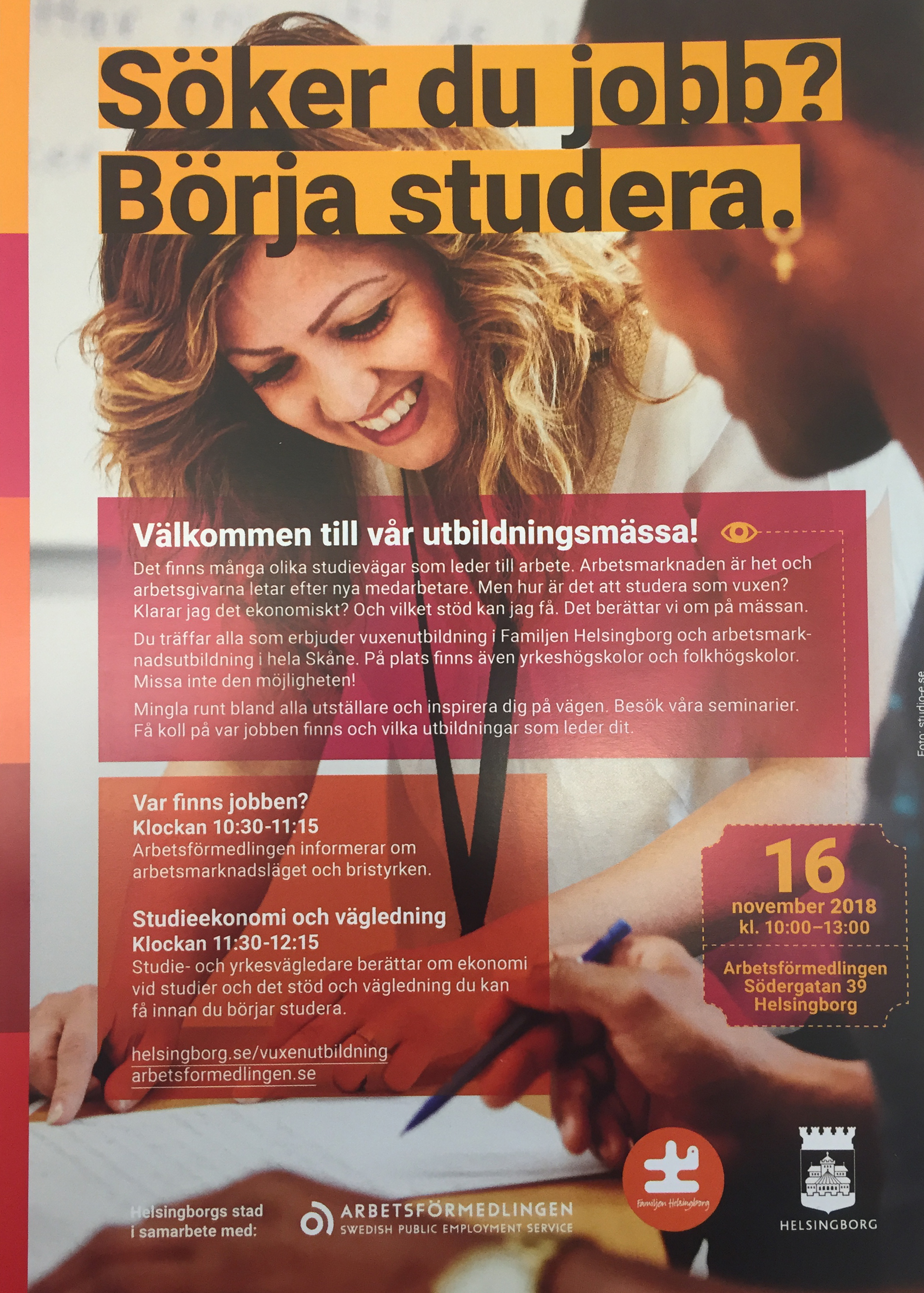 Den 16 november mellan klockan 10-13 är du välkommen på utbildningsmässa! Mässan är i arbetsförmedlingens lokaler på Södergatan 39.
