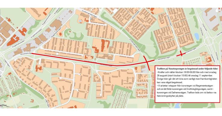 Från och med onsdag 28 augusti klockan 15:00 lägger vi ny asfalt på Vasatorps-vägen. Vi arbetar i etapper från korsningen vid Regementsvägen och en bit förbi korsningen vid Drottninghögsvägen, samt i korsningen vid Dalhemsvägen. Det blir begränsad framkomlighet på sträckan i cirka två veckor om allt går enligt plan. Vi arbetar kvällar och nätter för att minimera störningar i trafiken.