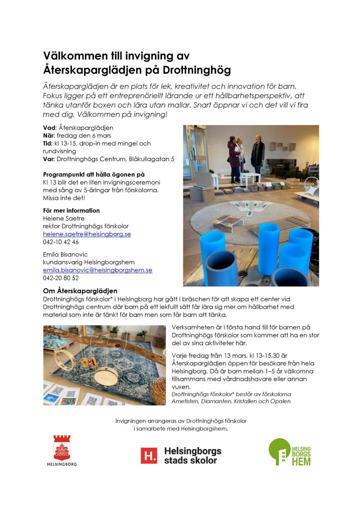 Avslutningsvis berättar Pernilla om den kommande invigningen av ”Återskaparglädjen” i Drottninghögs Centrum (Blåkullagatan 5), där barn och tillsammans med vuxna kan skapa tillsammans med återbrukat material för att på så sätt kunna ”lära sig mer om hållbarhet med material som inte är tänkt för barn men som får barn att tänka.”