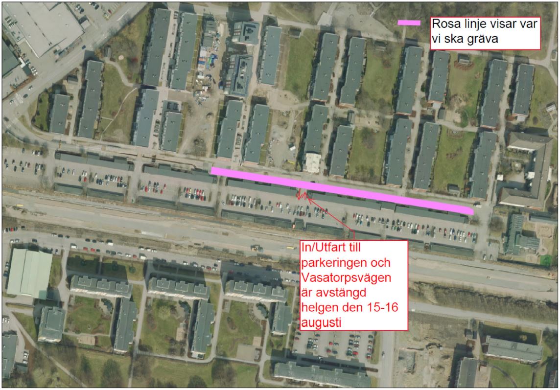 Infarter är tillgängliga under arbetet, förutom korta stunder vid själva grävningen. In/Utfarten till Vasatorpsvägen kommer att vara stängd under helgen den 15+16 augusti. Annars kommer denna väg att gå att använda som vanligt.