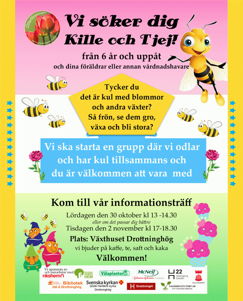 Vi ska bara lära mera om det där med att odla; att plantera, ta hand om, och skörda. Och ha kul tillsammans medan vi gör det! Och givetvis ska vi fika också på våra träffar!