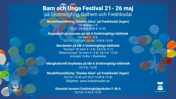 Barn och Unga Festival på Drottninghög, Dalhem och Fredriksdal. Musikföreställning ”Giselas Gåva” på Fredriksdal (logen) Till årskurs 2-5 22/5 - 25/5 kl. 9.00 & 10.30 Anmälan: Poul.Witting@helsingborg.se Sagostund på svenska på Idé A Drottninghögs bibliotek För barn 3 - 5 år. 22/5 kl. 9.00 och 25/5 kl. 9.00 & 10.00 Anmälan: Saul.Sagnia@helsingborg.se Barnteater på Idé... Fortsätt läsa →