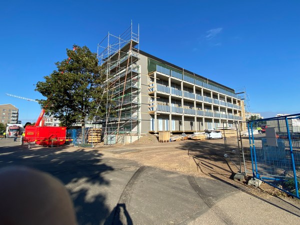 Här ser vi en bild på det ena fyravåningshuset med bostadsrättslägenheter från BoKlok som byggs för fullt på Grönkullagatan. Visste du att varje lägenhetsmodul byggs inomhus i en fabrik för att sedan transporteras vidare och monteras på plats. Det tar ungefär 30 minuter för en modul att monteras på plats, och upp till 22 stycken... Fortsätt läsa →